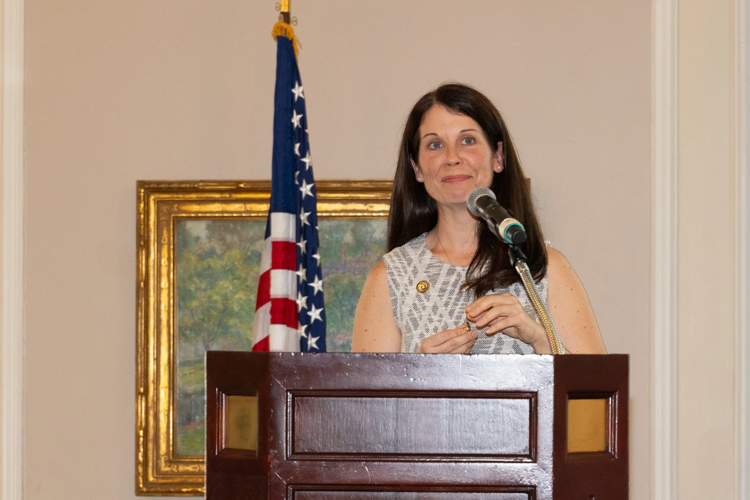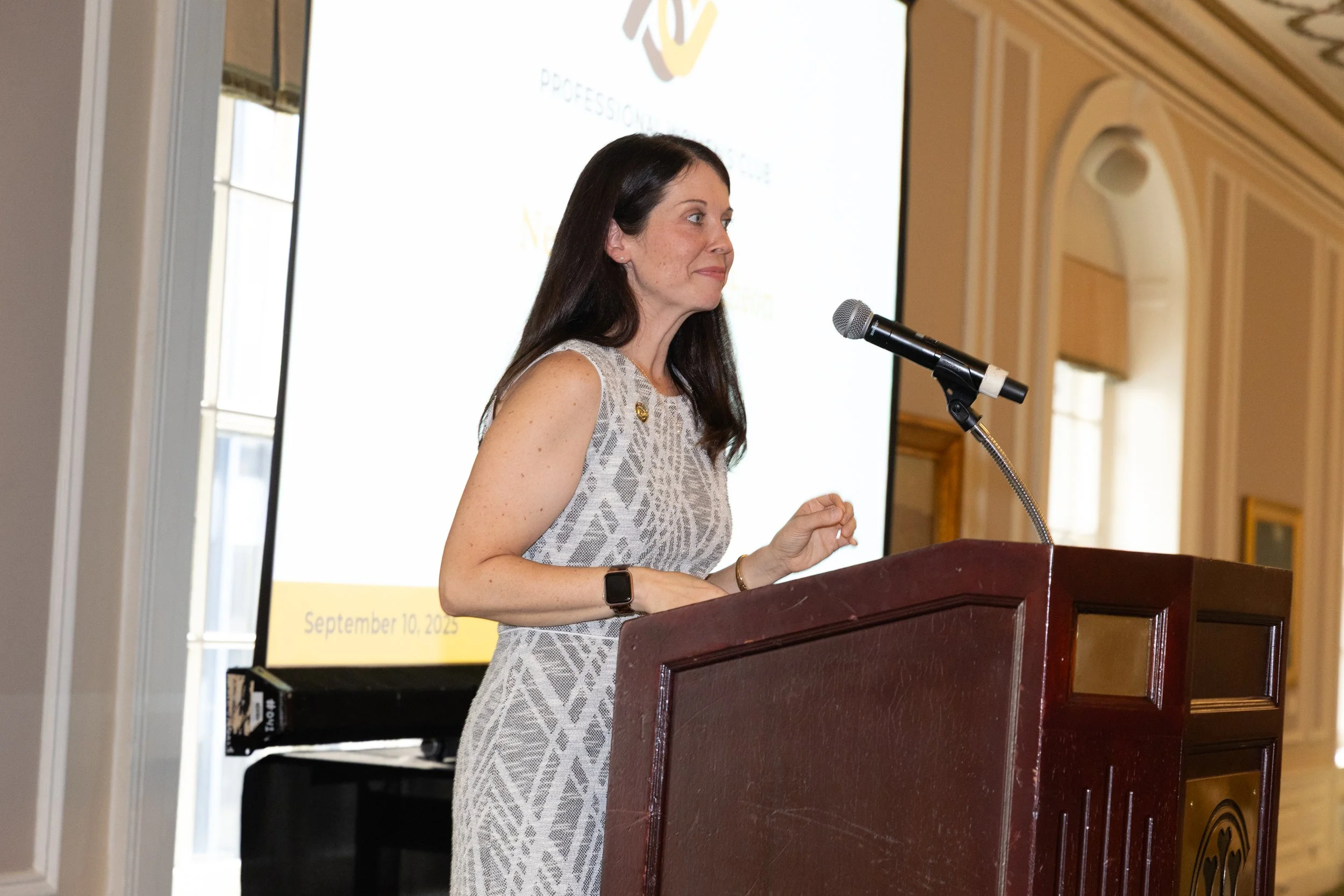 Betsy Barnich, President of PWCC, speaking at the 2025 September Luncheon.